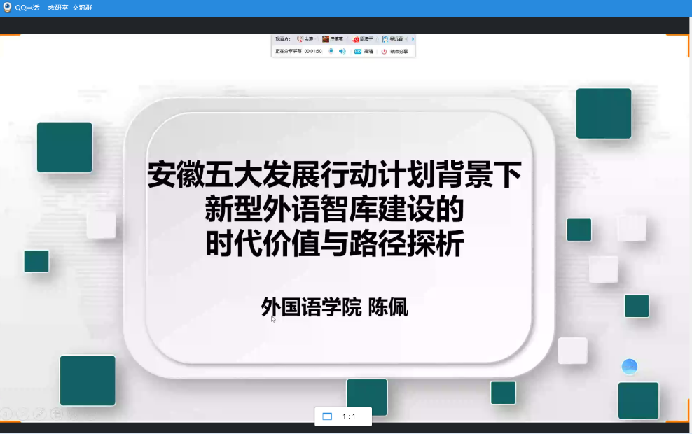 随后,陈佩老师从智库及外语智库的内涵出发,分析了安徽智库及外语智库建设现状,阐述了新时代安徽外语智库建设的重要意义,在此基础上,从体制机制、条件保障、人才培养、舆论传播等方面提出安徽新型外语智库建设的目标定位与路径安排。