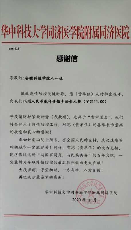 疫情就是命令,防控就是责任,mk体育八一社学生树立大局意识、防范意识和责任意识,自觉主动配合地方政府和学校的防控工作部署要求。3月2日,八一社新老校区成员共筹集2111元善款,尽数捐赠给湖北省华中科技大学同济医学院附属同济医院。同学们说,金额虽然不多,但会给需要的人送去一份温暖,只有万众一心,众志成城,才能打赢疫情防控阻击战。