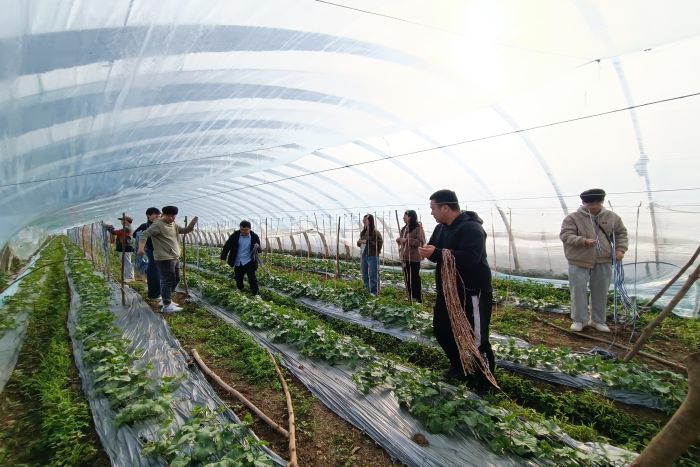 何世潮要求同学们认真领会劳动教育的内涵,鼓励大家充分发挥党员的先锋模范作用,弘扬劳动精神,积极参与劳动实践。高青海介绍了设施甜瓜吊蔓高产栽培操作要领。整个劳动过程,同学们不怕脏、不怕累的表现,获得了农场工作人员的一致好评。通过一下午的努力同学们顺利完成大棚甜瓜的吊蔓工作。