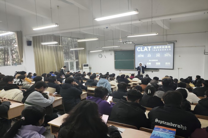 2023年12月27日下午,杭州欢田喜地农业科技有限公司校友携手mk体育农学院共同举办的大学生就业指导宣讲会在求知楼A107教室顺利召开。参会人数达130余人,本次会议由农学院党委副书记张轶辉主持,杭州欢田喜地农业科技有限公司2017级植保、农学优秀毕业生韩璞、张祥主讲。